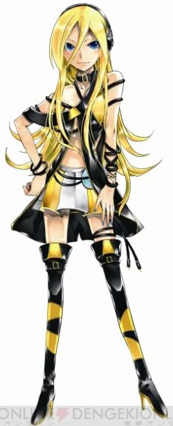 Everelle is a tall woman with long blonde hair and shining sapphire eyes. A bunch of hair runs down her face. She wears a black Magic Headphones on her head. A black belt-like collar is on her neck. Her yellow top is really short. Starting from above her breasts and ends just below. Black straps from the middle of her top are hung on her neck, shoulder and below her shoulder. A thick black strap with a little yellow runs down from her right shoulder to her left elbow. A cape runs from the middle of her top to her thighs. It is split, revealing her stomach. Two black bracelets are worn below her right shoulder. She also wears two black bracelets on her left wristand six black bracelets on her right wrist. A bracelet-looking heart tattoo is on her right wrist. Her short skirt is white with yellow parts. She has two black bands(?) on her right thigh. She wears long, high-heeled black boots with some yellow on them. At the knee part of her boots are two black mini-belts. On her skirt, she wears two black bands which acts like belts with a CD attached on it.
